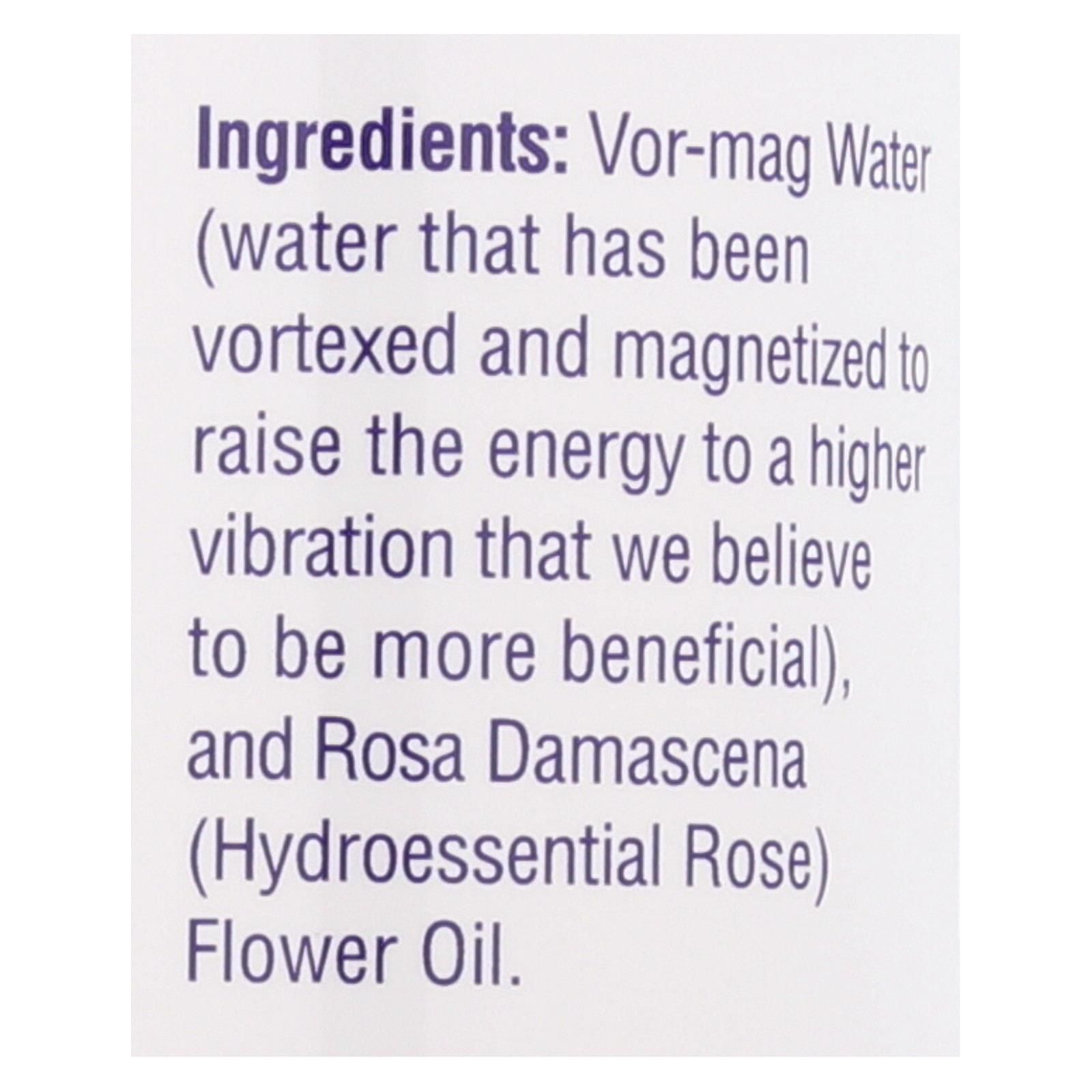 ingredients : vor-mag water;water that has been vortexed and magnetized to raise the energy to a higher vibration that we believe to be more beneficial;and rosa damascena;hydroessential rose;flower oil